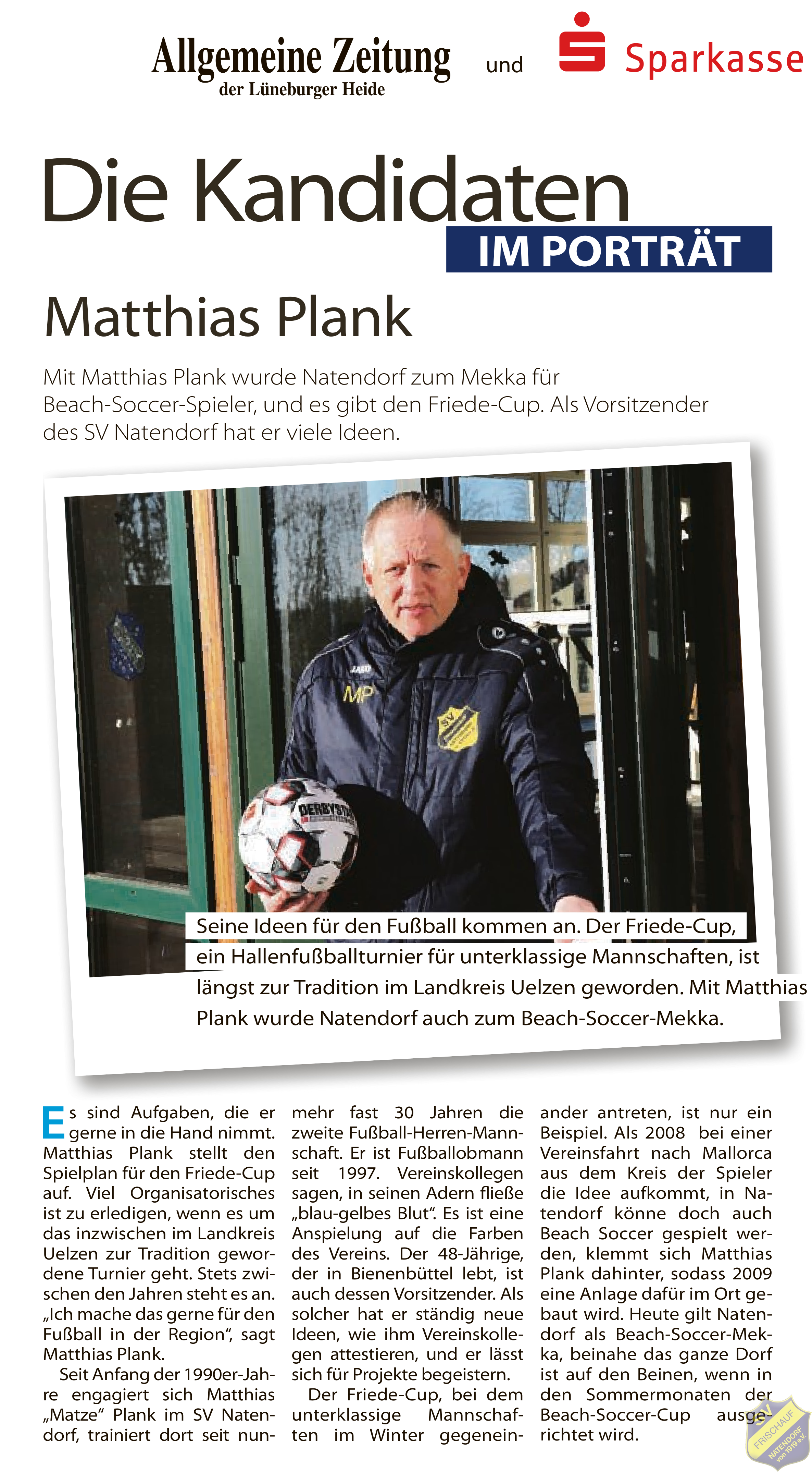Jährlich zeichnet die Allgemeine Zeitung der Lüneburger Heide verdiente Ehrenamtliche und erfolgreiche Sportler aus. In diesem Jahr ist unser Cheforganisartor des Beach Soccer Cup in Natendorf, Friede-Cup in Uelzen und Vorsitzende des SV Natendorf Matthias Plank in der Kategorie Ehrenamt nominiert.